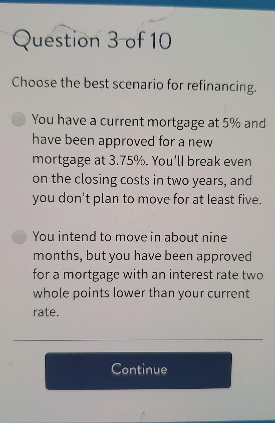 The best scenario for refinancing is. Question 3 of 10 Choose the best scenario for refinancing. Youll break even on the closing.